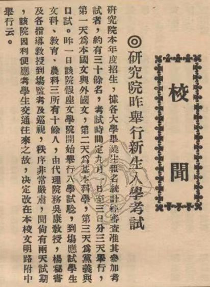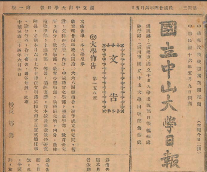 抗战时期,中山大学辗转澄江、坪石期间仍继续招收研究生,弦歌不辍。1939年研究院招生简章亦是借四川大学校刊代为刊登。